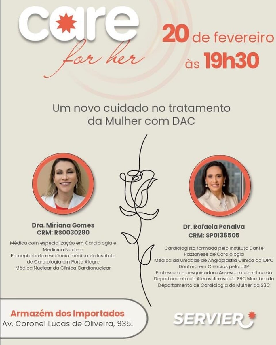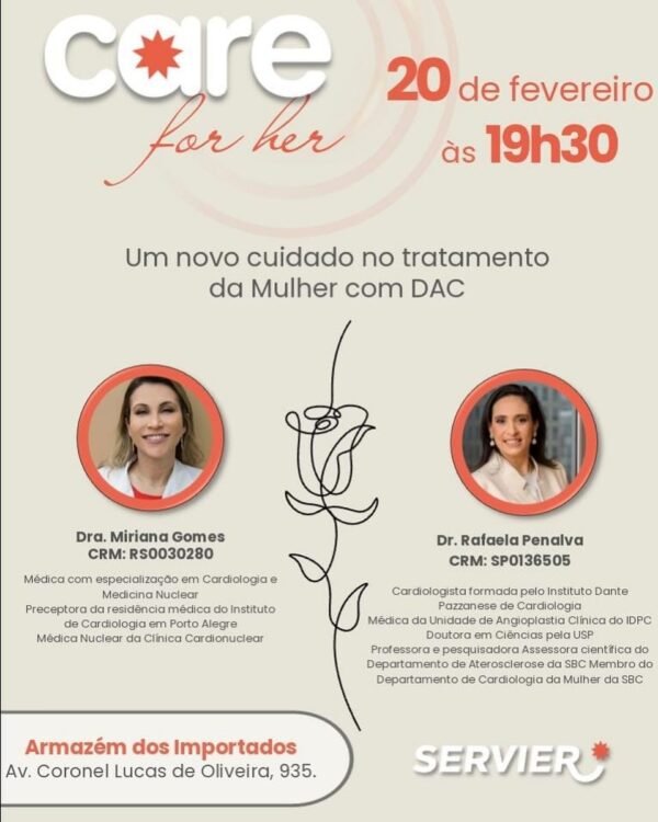 No dia 20 de fevereiro de 2025, ocorreu este evento exclusivo para mulheres cardiologistas. Um grupo seleto de colegas de Porto Alegre participou de um jantar, enquanto outras de cidades distantes acompanharam de forma on-line. O evento teve como tema central “O Cuidado no Tratamento da Mulher com DAC (Doença Arterial Coronariana)” . Além da Dra Miriana Gomes, palestrou, vinda diretamente de São Paulo, a Dra Dra.Rafaela Penalva que é doutora em cardiologia pela USP, médica da unidade de angioplastia clínica do Instituto Dante Pazzanese e Fellow da American College de Cardiologia.